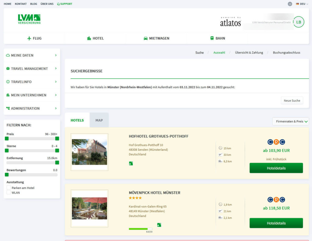2017 führten die LVM Versicherung die Online Booking Engine, den Atlatos Profi Traveller, ein. Für die Tochtergesellschaft Augsburger Aktienbank wurden 2018 auch der End-2-End Prozess, die Online Booking Engine inkl. Reisekostenabrechnung, implementiert.